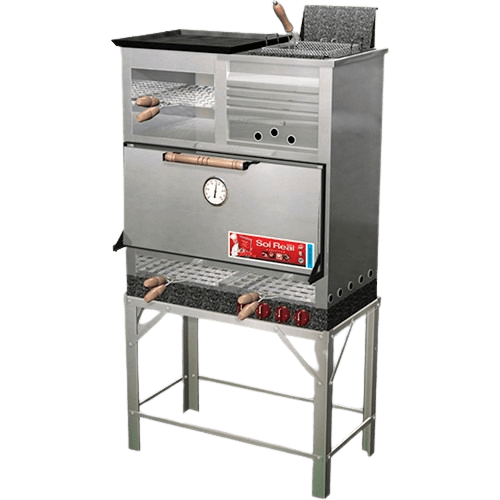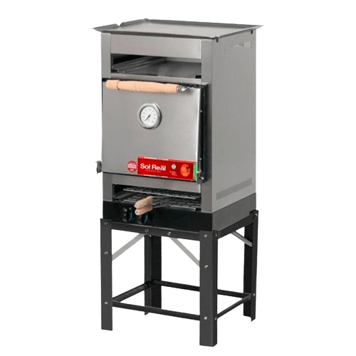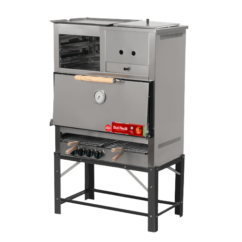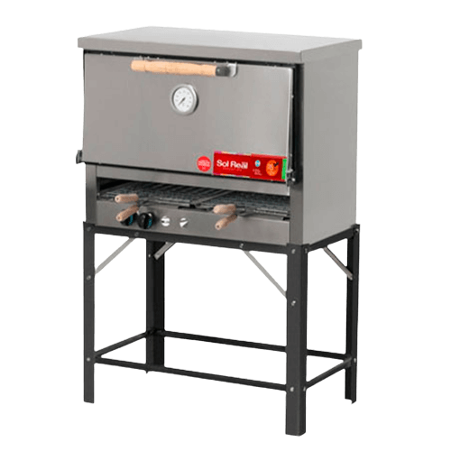 Puerta desmontable de acero inoxidable con manija de madera, bisagras irrompibles y pirómetro analógico.